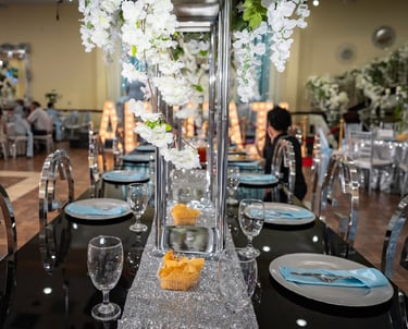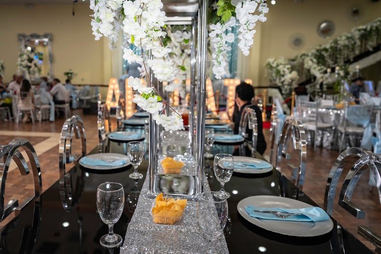 Los centros de mesa han sido cuidadosamente diseñados para realizar la elegancia y el estilo del salón de banquetes. Cada composición combina equilibrio, armonía y sofisticación, reflejando una atención meticulosa a los detalles.
