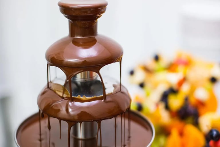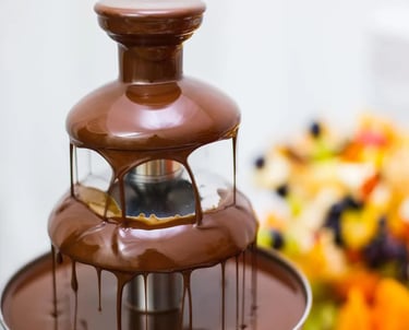 El chocolate, de la más alta calidad, se mantiene a la temperatura ideal para conservar su textura sedosa y su aroma exquisito. A su alrededor se dispone una selección de frutas frescas, malvaviscos, galletas finas y bocadillos gourmet, permitiendo a los invitados disfrutar de una experiencia dulce y refinada.