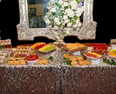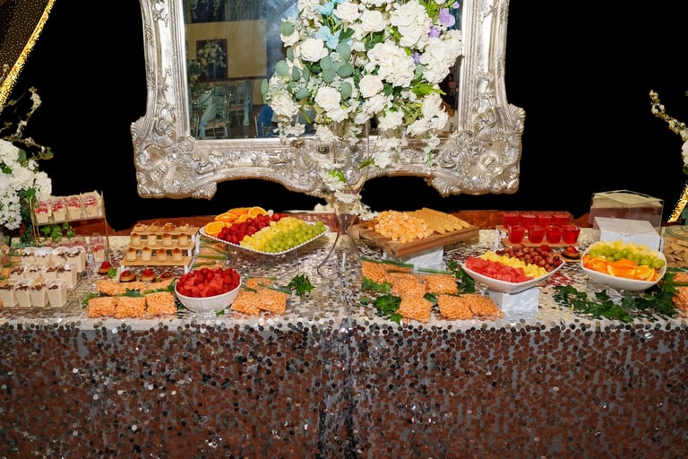 Dispuesta sobre bases de cristal y porcelana, la selección incluye una variedad de frutas de temporada finamente cortadas y dispuestas en formas artísticas que realzan la belleza natural de cada elemento. En armonía con la decoración general del evento, la mesa se adorna con detalles florales y elementos decorativos sobrios que aportan un toque de distinción.