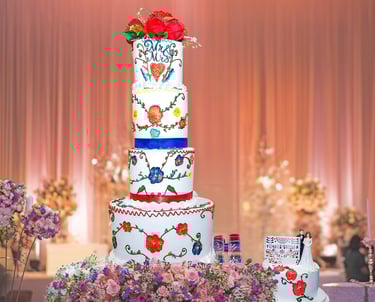 El pastel, pieza central de la celebración, se presenta como un símbolo de elegancia y buen gusto que realza la distinción del evento. Elaborado por reposteros expertos, combina diseño artístico, ingredientes de la más alta calidad y una presentación impecable que armoniza con la estética general del salón de banquetes.